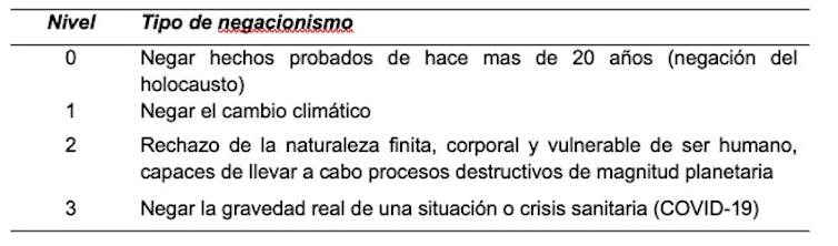 Riechmann proponía 4 niveles de negacionismo y en marzo se preguntaba si aprenderíamos de la actual crisis sanitaria. Desgraciadamente, varios meses después podemos decir que no hemos aprendido mucho y que, muy al contrario, los grupos negacionistas ganan terreno. Incluso ha nacido un grupo de médicos negacionistas, los “Médicos por la verdad”, que difunden que el coronavirus no es más que una gripe. Sin olvidar a los políticos negacionistas, como D. Trump o J. Bolsonaro, que ignoran las recomendaciones de las autoridades sanitarias y las evidencias científicas.