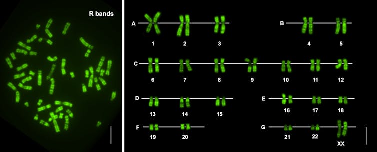 En los seres humanos, cada célula tiene, típicamente, 46 cromosomas organizados en 23 pares. Esto es lo que nos define como especie y nos diferencia de chimpancés y orangutanes, que poseen cariotipos con 24 pares de cromosomas.