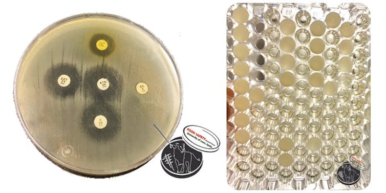 La determinación de la resistencia se puede hacer en placas de Petri con agar mediante ensayos de difusión por disco, para lo que se emplean discos de celulosa impregnados con el antibiótico a estudiar. Las bacterias sensibles al antibiótico no son capaces de crecer en la proximidad del disco, por lo que se forman halos de inhibición.