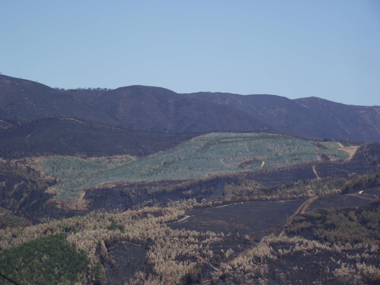 El incendio de 2016 en la sierra de Arada-Freida (Portugal) ardió con mucha menor severidad en las plantaciones de eucaliptos (verde) que en el matorral adyacente (negro) debido a las diferencias en la estructura de la vegetación. Paulo M. Fernandes, Author provided