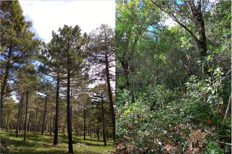 Pinar de repoblación con inflamabilidad baja (izquierda) y encinar con inflamabilidad elevada (derecha) en la cordillera prelitoral de Tarragona. Las diferencias en la inflamabilidad derivan de la estructura, no de la especie. Resco de Dios V. 2020. ‘Plant-Fire Interactions: Applying Ecophysiology to Wildfire Managament’. Springer, Author provided