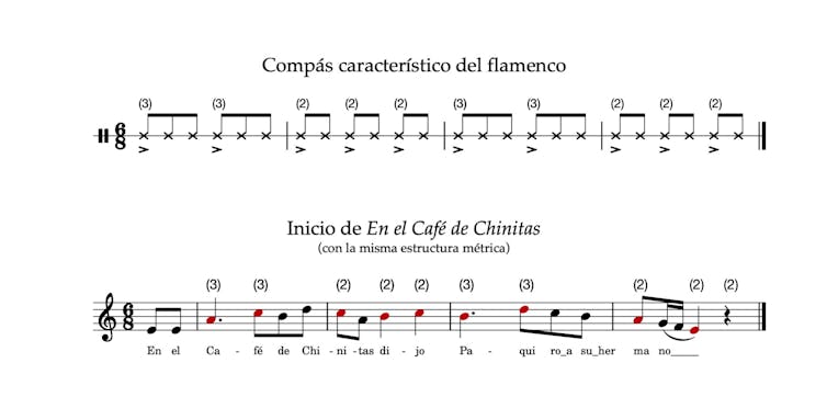 Más aún, los humanos percibimos el pulso de forma flexible, adaptándonos con rapidez a los cambios de velocidad y ritmo. El compás de amalgama, característico del flamenco, es un ejemplo de esa flexibilidad. En él, todos los compases contienen seis unidades de tiempo que se agrupan con alternancia en conjuntos de tres notas (dos grupos de tres) y en conjuntos de dos (tres grupos de dos). Esta es la estructura habitual de palos como la bulería o de la canción popular En el Café de Chinitas de Lorca.