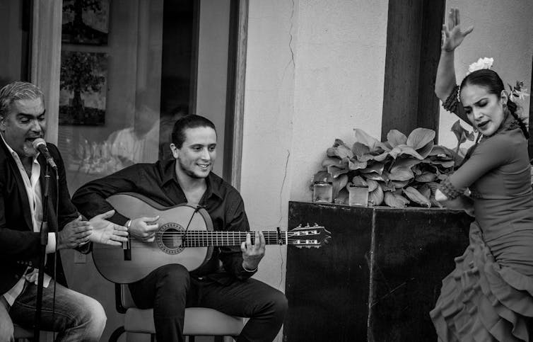 Así, aunque algunas especies de simios a veces realizan percusiones sobre troncos y otros objetos, no podrían ajustar sus golpes a la acentuación compleja del flamenco. Y menos aún podrían cantarlo, debido a su limitada capacidad de aprendizaje vocal (lo que también les impide el habla).